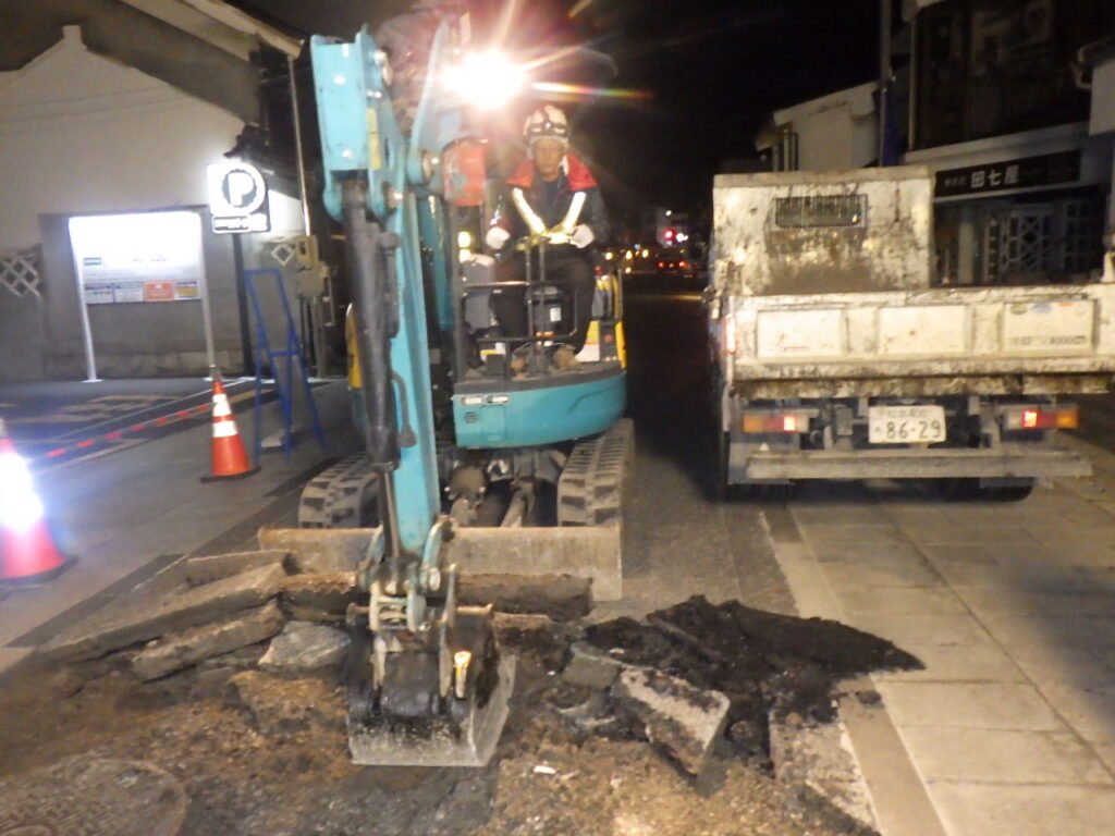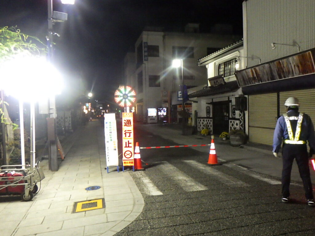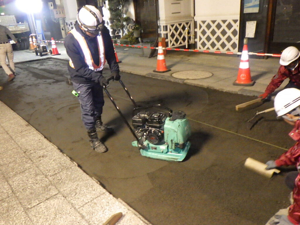工事は夜間(22:00~5:00)に車両通行止めで行いました。