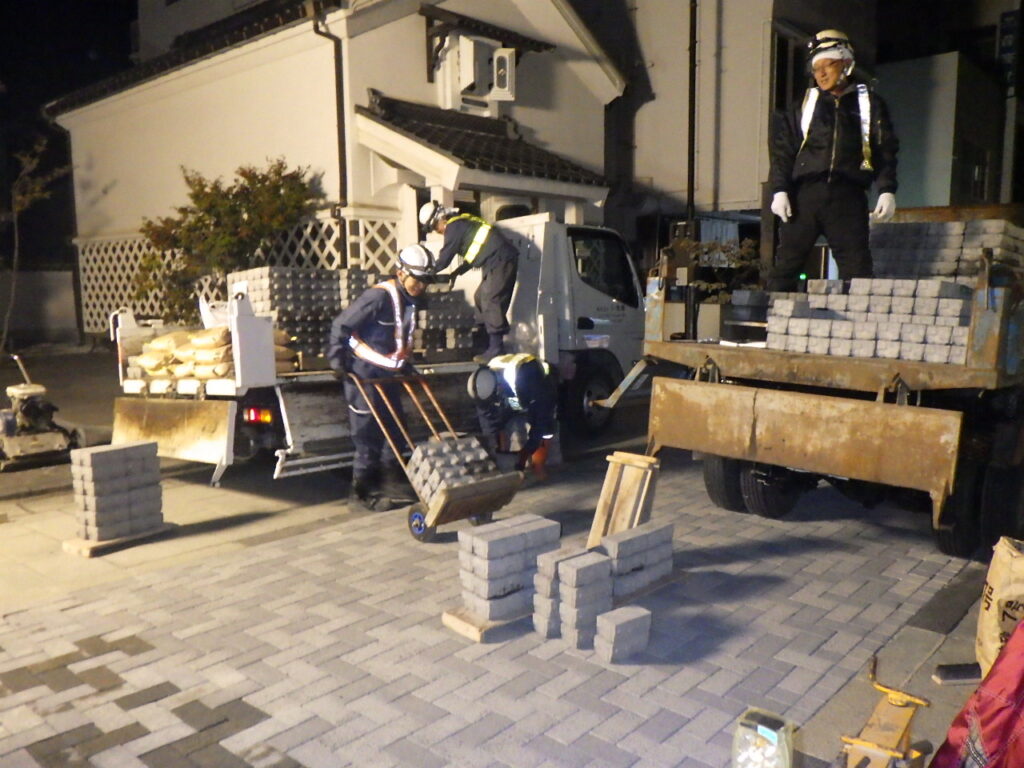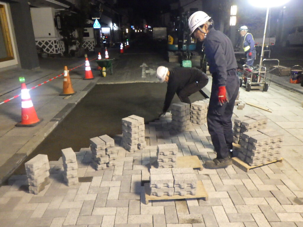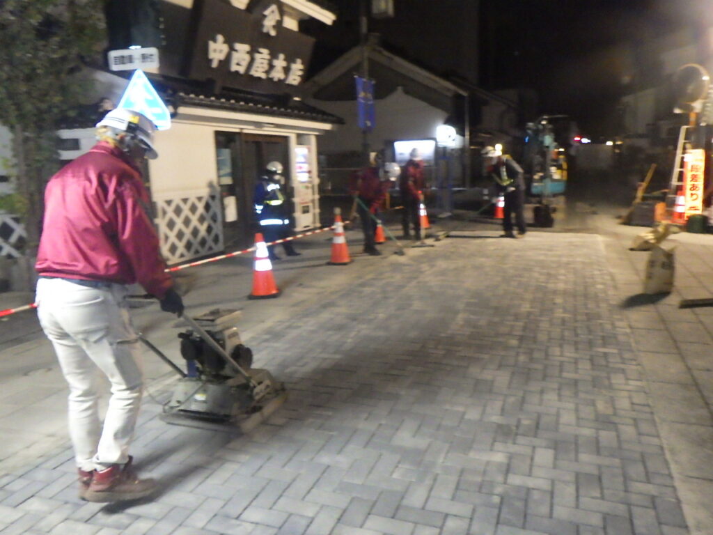 この工事は、もともとの舗装が経年の劣化のための補修で継ぎはぎになっている箇所も多く、観光地と言うこともあり「インターロッキングブロック舗装」という舗装でキレイにするものでした。