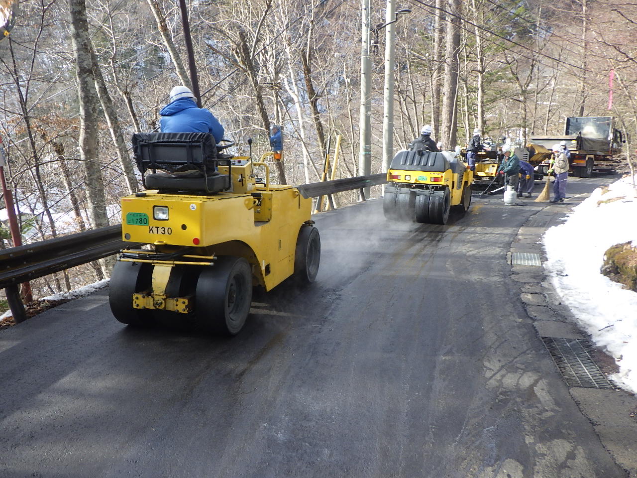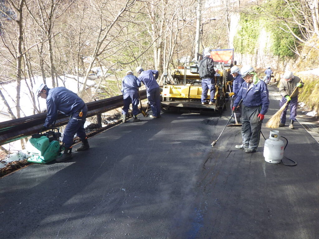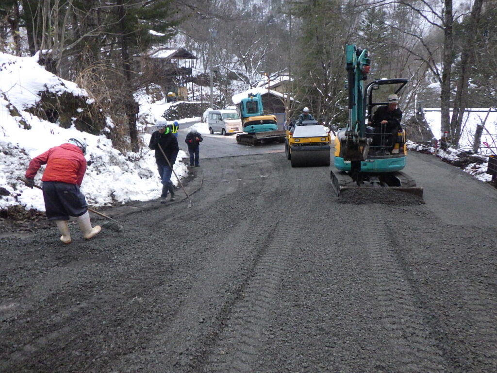冬季間の施工であり、観光地のため限られた作業時間(9:00~16:00)での施工でした。期間中は毎日のように雪が降り、心が折れそうになったことが何回かありましたが、12月24日に最終の舗設が終わり気持ちよく新年を迎えることができました。ご協力ありがとうございました。