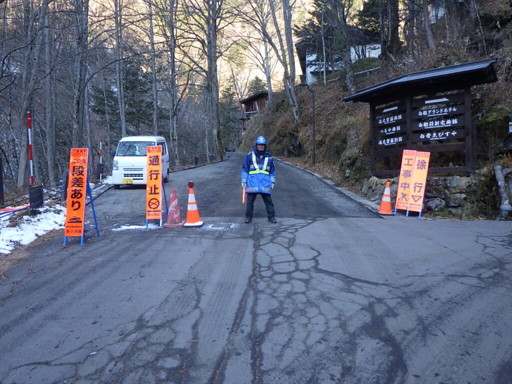 現場は温泉旅館へ通じる幹線道路であり、紅葉の時期とも重なり観光客、観光バスが多く訪れ、一般車両を通しながらの施工となりました。