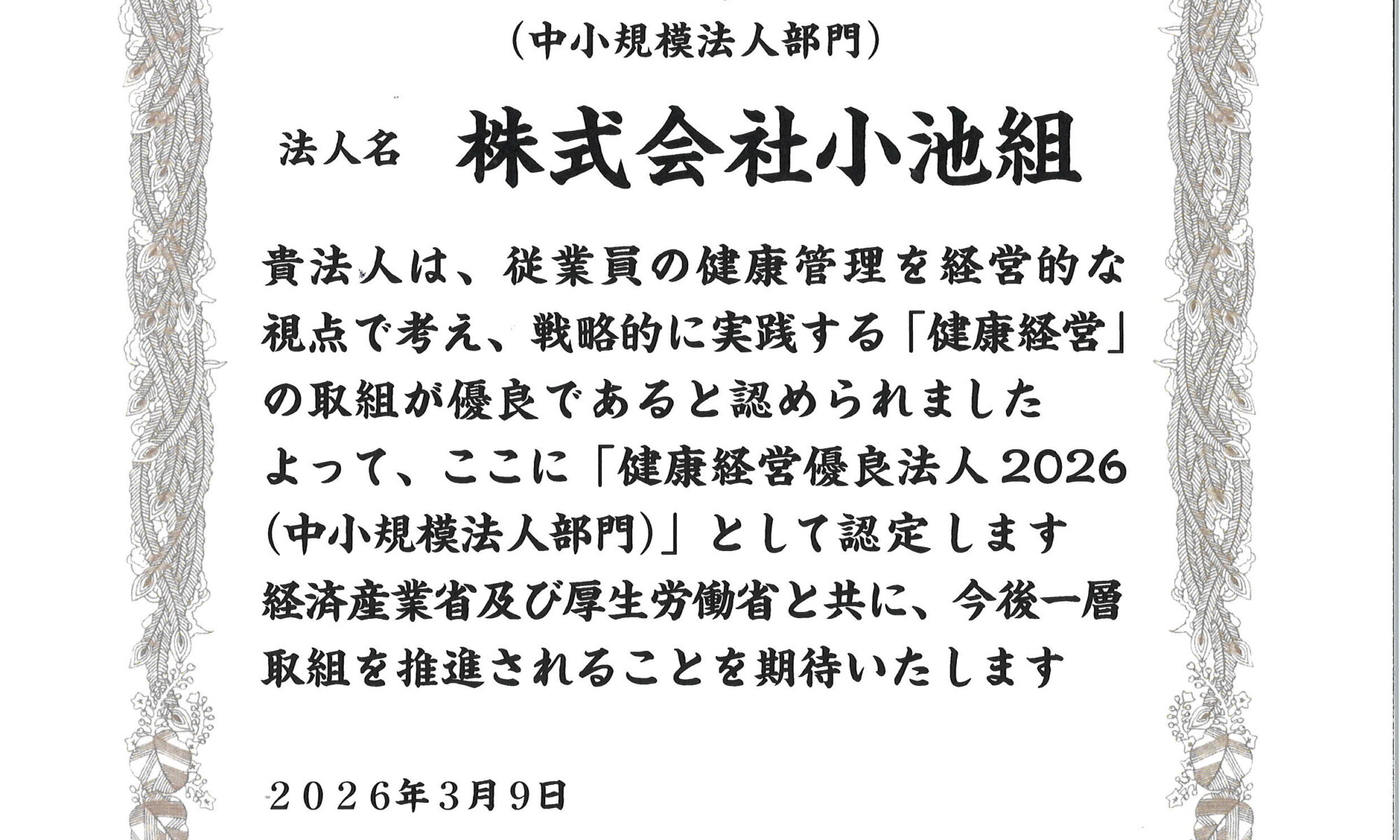 2026 健康優良法人認定されました。 2026.3.09